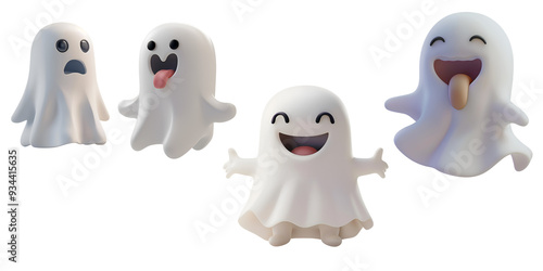 Collection Set of Halloween Ghosts with Very Funny Faces in 3D Cartoon Animation Style, Isolated on Transparent Background, PNG