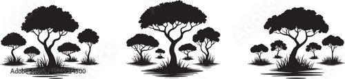 Collection set of Savanna Tree Silhouette Set with Acacia Trees and Grassland Landscape vector silhouette
