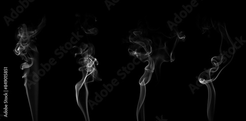 Collection set of white smoke moving on black background. Smoke clouds. Isolated abstract lines.