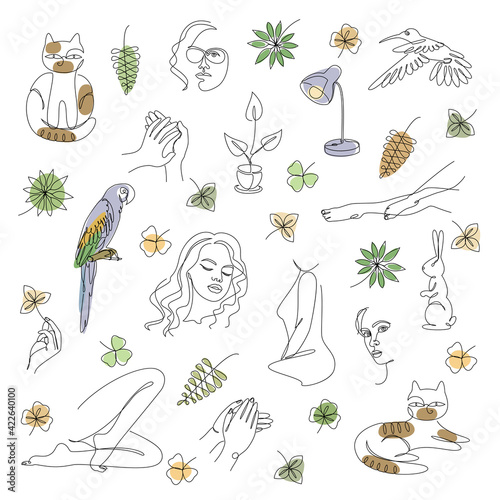 Collection. Silhouette of lady, cat, bird and leaves in modern one line style. Solid line, outline for decor, posters, stickers, logo. Set of vector illustrations set.