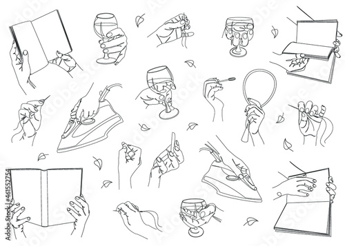 Collection. Silhouettes of a human hand that holds a book, iron, glass, lipstick, mirror, needle in a modern style in a solid line. Sketches, posters, stickers, logo. Set of vector illustrations.