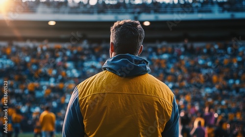 College stadium with the coach giving a pep talk to the team. Featuring leadership and motivation
