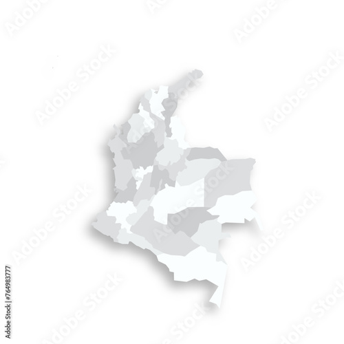 Colombia political map of administrative divisions - departments and capital district. Grey blank flat vector map with dropped shadow.