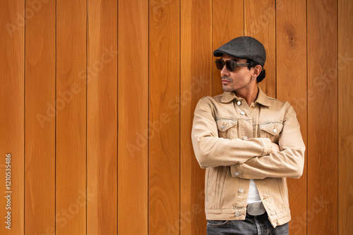Colombian gay man standing by wooden wall with arms crossed