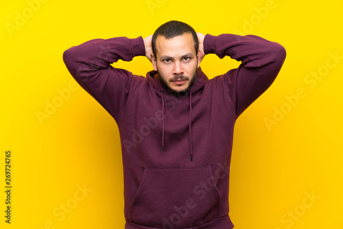 Colombian man with sweatshirt over yellow wall frustrated and takes hands on head