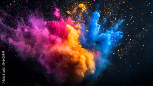 Color explosion with vibrant pink, orange, and blue against a dark background.