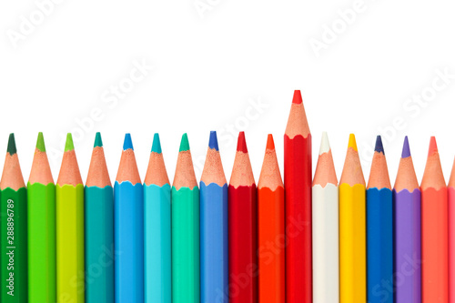 Color pencils arranged horizontally in a line on white background with one standing out from the rest, with space for text. It's symbol of leadership. teamwork. success and unique