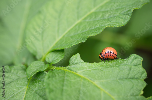 Colorado beetle (Leptinotarsa decemlineata) larva eating leaf of potato plant. Close-up of insect pest causing huge damage to harvest in farms and gardens