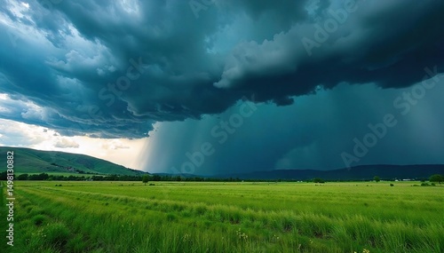 Colorado's dramatic summer thunderstorm rolls in, dark clouds unleashing a torrential downpour over a vibrant green landscape The rain-soaked earth reflects the stormy sky , rain, field