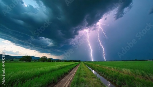 Colorado's dramatic summer thunderstorm rolls in, dark clouds unleashing a torrential downpour over a vibrant green landscape The rain-soaked earth reflects the stormy sky , summer, heavy rain