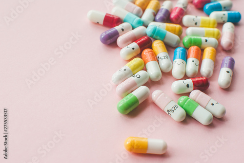 Colored capsule on a pastel pink background