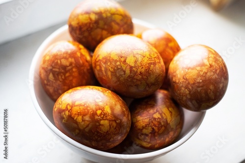 colored colorful chicken eggs in a large white plate as a symbol of the national holiday of believers