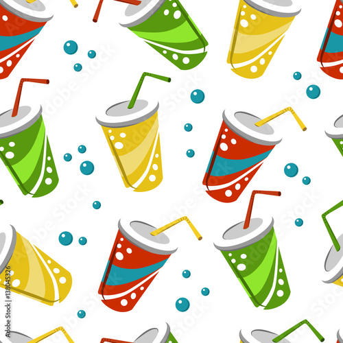 Colored paper cups with straw and the bubbles of soda on white background. pattern