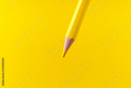 Colored pencil close-up with selective focus on the stylus and a blurred yellow background. Copy space
