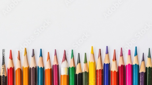 Colored pencils and paint brushes neatly arranged on a white workspace ready for creative projects during the daytime