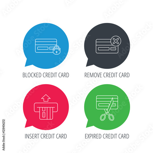 Colored speech bubbles. Bank credit card icons. Banking, blocked and expired debit card linear signs. Flat web buttons with linear icons. Vector