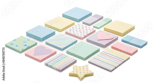 Colored sticky note collection arranged in pastel tones, isolated set.