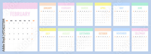 Colorful 2026 Calendar template vertical pages set. Week starts on Sunday. Fun monthly english planner for the year.