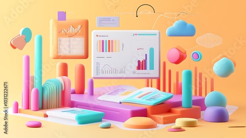 Colorful 3D Abstract Composition with Charts and Geometric Shapes
