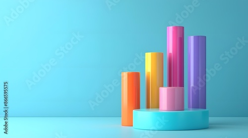 Colorful 3D bar chart on a blue background, representing data visualization, business analysis, and statistical growth.