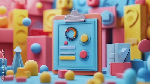 Colorful 3D rendered clipboard with charts and data amidst geometric shapes.