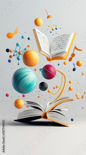 Colorful 3d shapes with atoms music notes and books on gray background