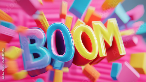 Colorful 3D text effect displaying 'BOOM!' against a vibrant pink background.