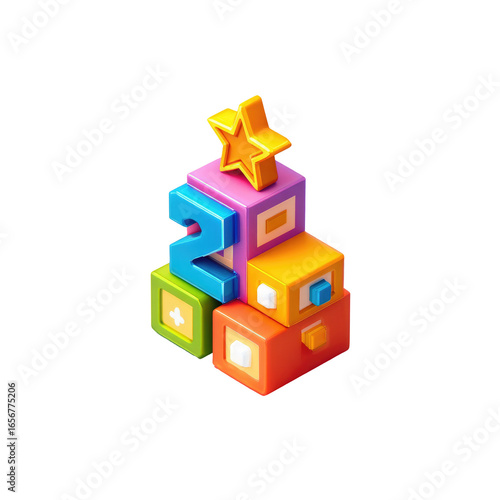 Colorful, 3D-rendered blocks stacked into a stylized tree shape with a star atop, and the number "20" visible