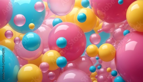 Colorful abstract background with various sized bubbles or spheres in shades of (pink, yellow, blue, turquoise