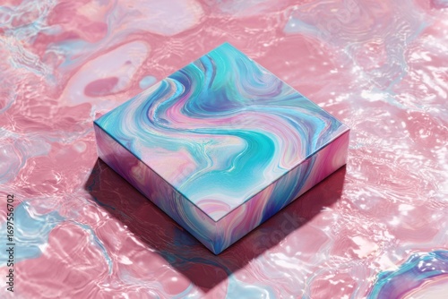 Colorful Abstract Box on Fluid Surface with Swirls of Pink and Blue Hues for Creative and Artistic Concepts