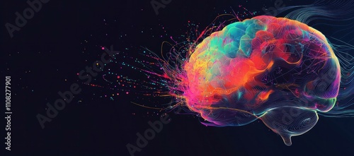 Colorful abstract brain illustration with vibrant splashes of color, representing creativity and cognitive processes against a dark background.