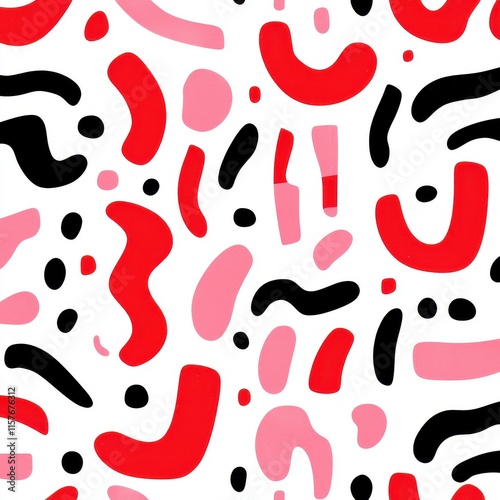 Colorful abstract design featuring bold red, pink, and black shapes on a white background.