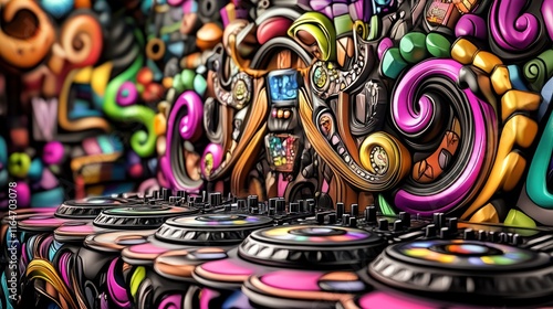Colorful abstract DJ setup with vibrant swirls and patterns.
