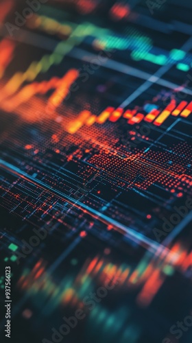 Colorful abstract financial data visualization with digital stock market graph and chart analysis, representing economic performance trends.
