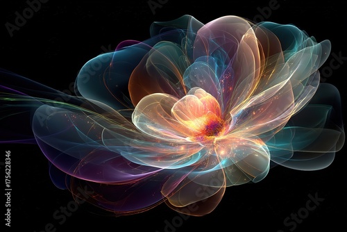 Colorful abstract flower design with glowing petals and soft textures on a dark background