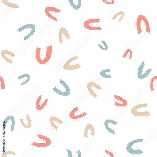 Colorful abstract geometric seamless pattern Simple retro shapes, letters, signs, symbols in pastel delicate colors White background