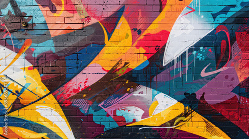 Colorful Abstract Graffiti on Brick Wall. Dynamic and colorful abstract graffiti art painted on a brick wall, featuring bold shapes, vibrant colors, and urban street style.