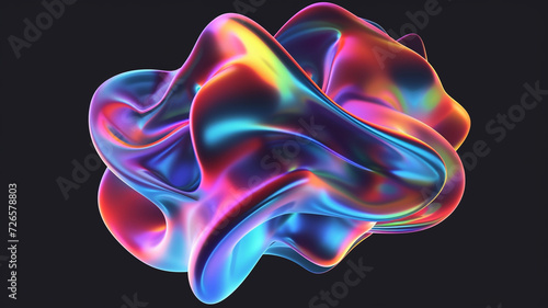 Colorful abstract holographic shape floating on black background. Transparent glass texture on wavy figure.