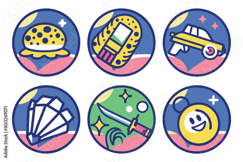 Colorful abstract icons featuring food vehicle gem sword and face set of
