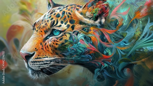 Colorful abstract illustration of a spotted cat's head.