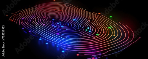 Colorful abstract neon fingerprint on black background. Swirling lines design. Glowing ID wallpaper