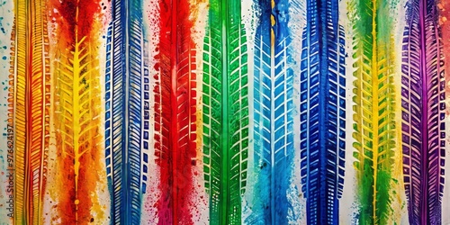 Colorful, abstract painting created with car tire tracks on a white canvas background