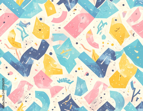 Colorful abstract pattern of geometric shapes in pink, yellow, blue, and navy against a cream background. Fun, whimsical, and modern.