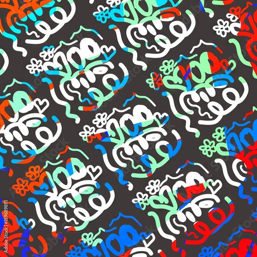 Colorful abstract pattern with floral elements on dark background