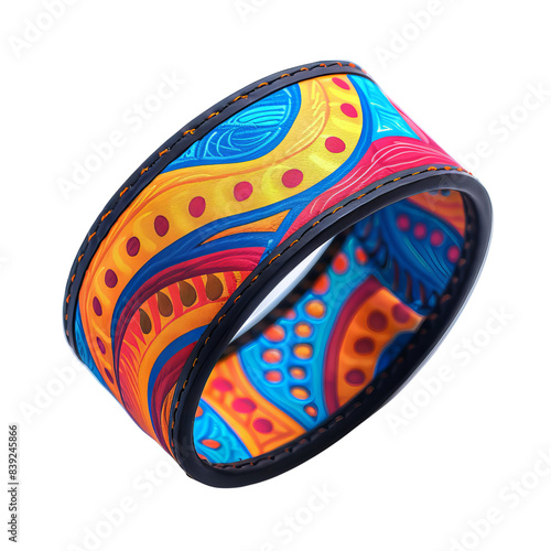 Colorful abstract patterned bracelet with vibrant blue, yellow, and red hues on a white background. Perfect for fashion and accessory images.