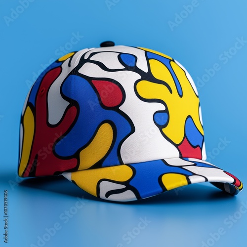 Colorful abstract patterned cap resting against a bright blue background