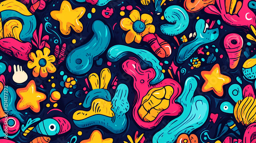 Colorful abstract patterns with various shapes and elements celebrating creativity and fun