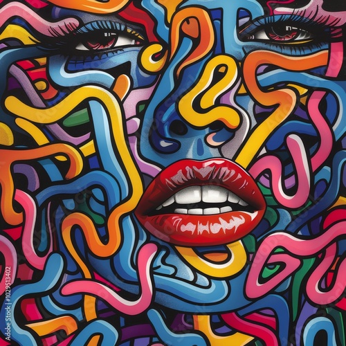 Colorful abstract portrait featuring vibrant patterns and striking facial features