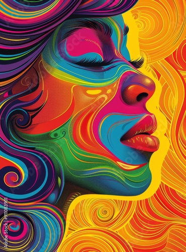 Colorful abstract portrait of a woman's face with vibrant patterns and swirls