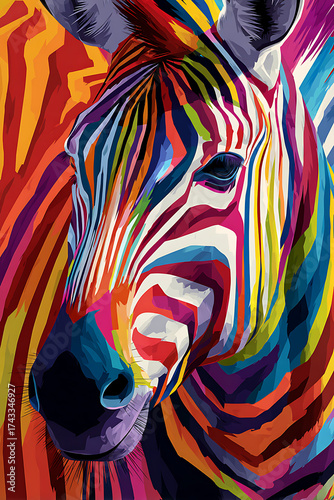 Colorful abstract representation of a zebra's head with vibrant stripes in a lively environment